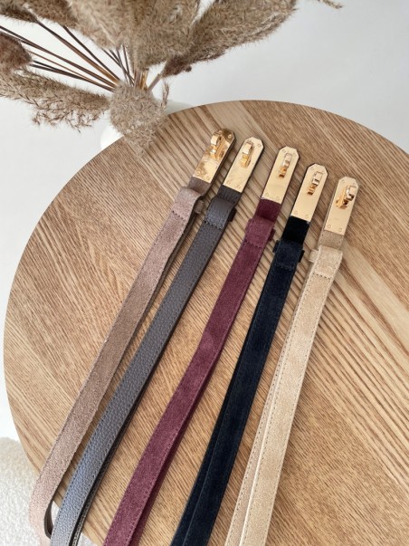 Elegancki pasek wykonany z miękkiej skóry zamszowej w uniwersalnym odcieniu czekolady. Wyposażony w stylową złotą klamrę oraz regulację, która pozwala idealnie dopasować go do sylwetki.