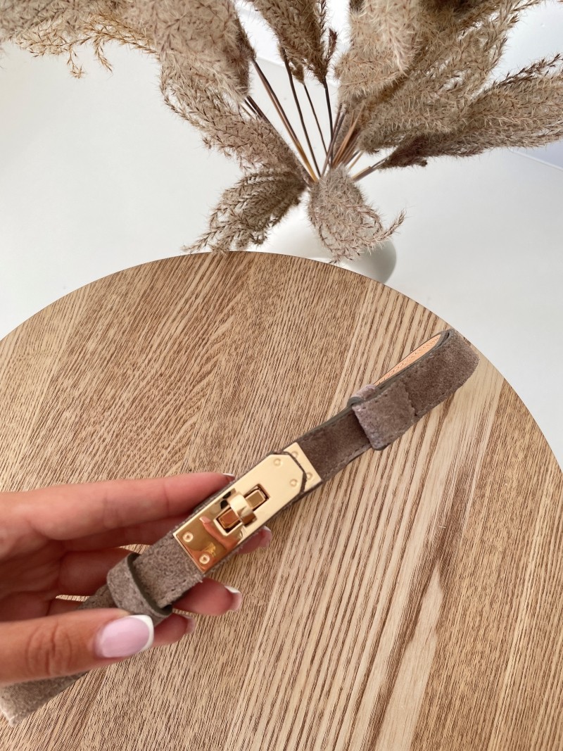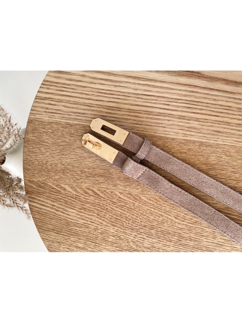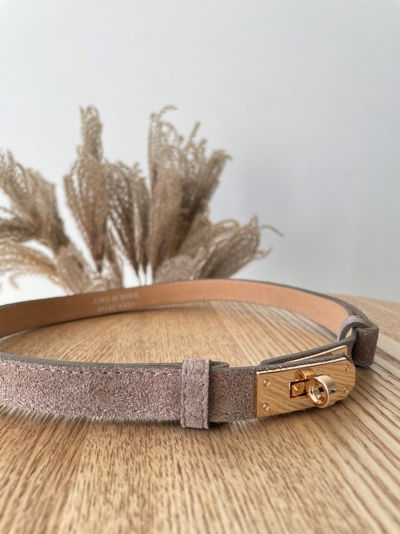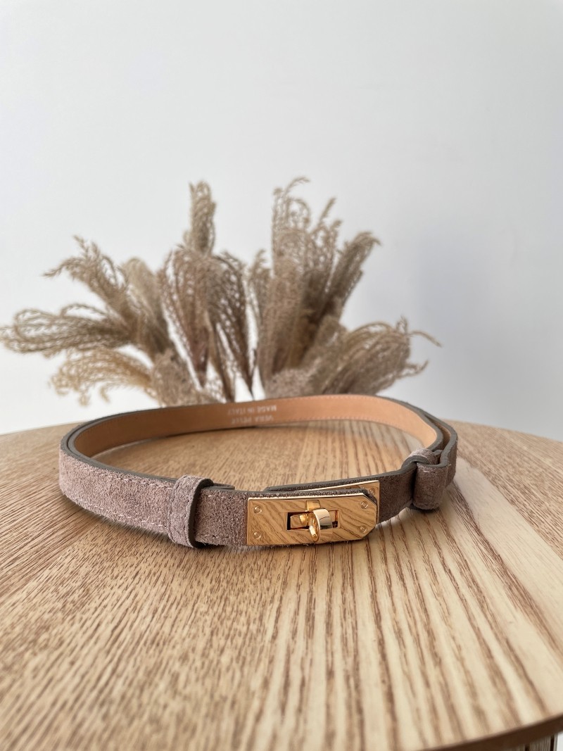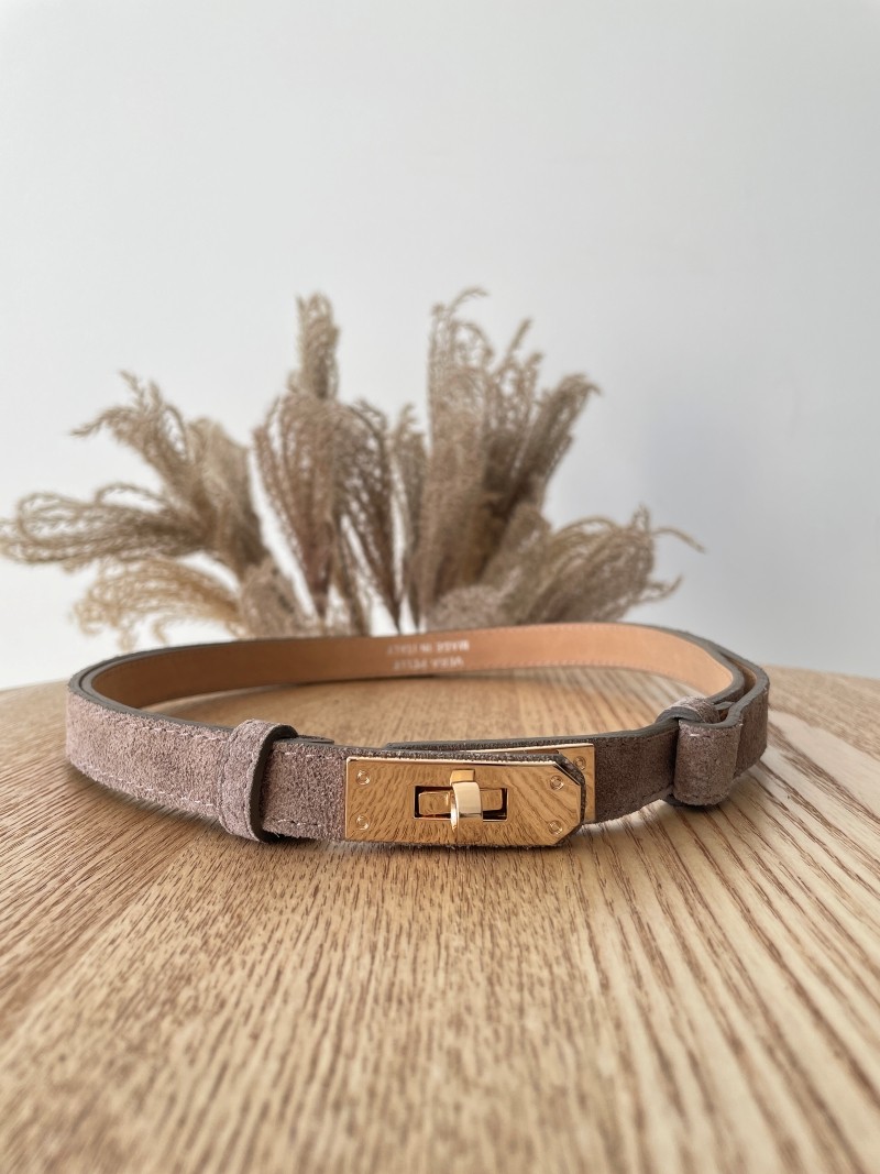 Elegancki pasek wykonany z miękkiej skóry zamszowej w uniwersalnym odcieniu fango. Wyposażony w stylową złotą klamrę oraz regulację, która pozwala idealnie dopasować go do sylwetki.