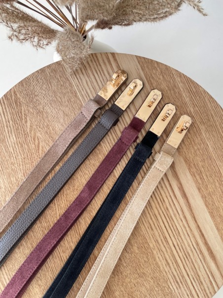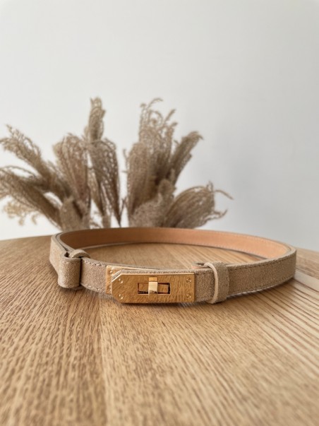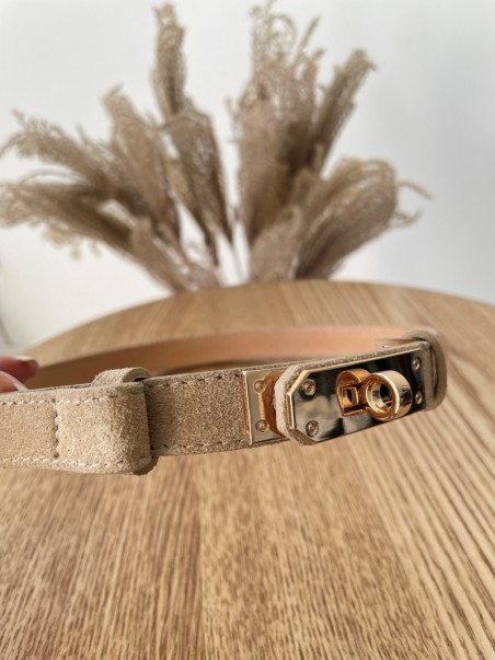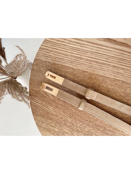 Elegancki pasek wykonany z miękkiej skóry zamszowej w uniwersalnym odcieniu beżu. Wyposażony w stylową złotą klamrę oraz regulację, która pozwala idealnie dopasować go do sylwetki.