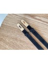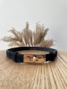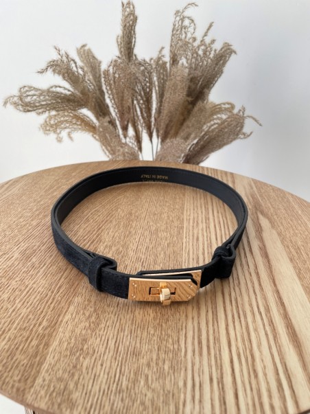 Elegancki pasek wykonany z miękkiej skóry zamszowej w uniwersalnym odcieniu czerni. Wyposażony w stylową złotą klamrę oraz regulację, która pozwala idealnie dopasować go do sylwetki.