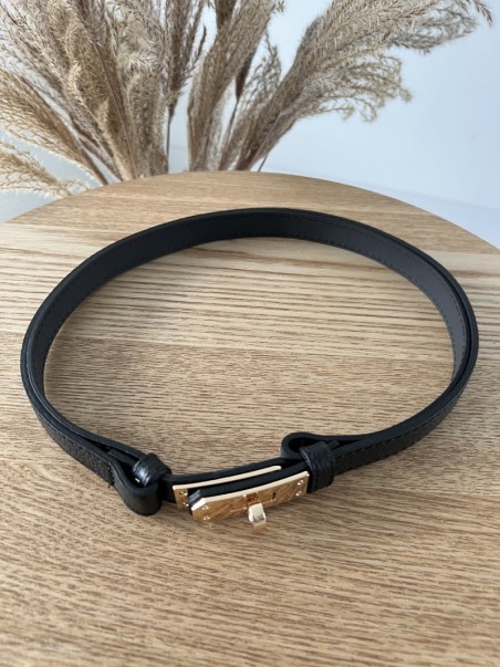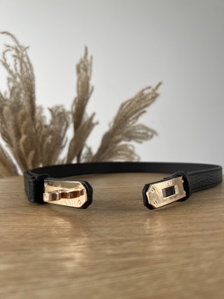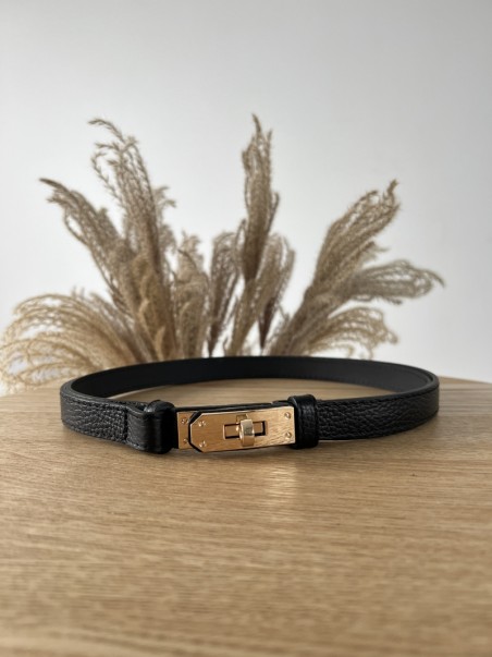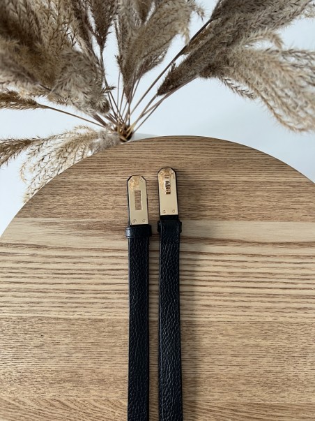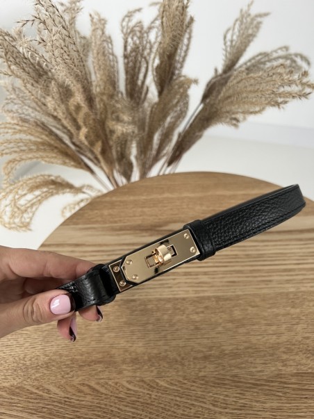 Elegancki pasek wykonany z miękkiej skóry licowej w uniwersalnym odcieniu czerni. Wyposażony w stylową złotą klamrę oraz regulację, która pozwala idealnie dopasować go do sylwetki.