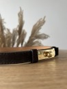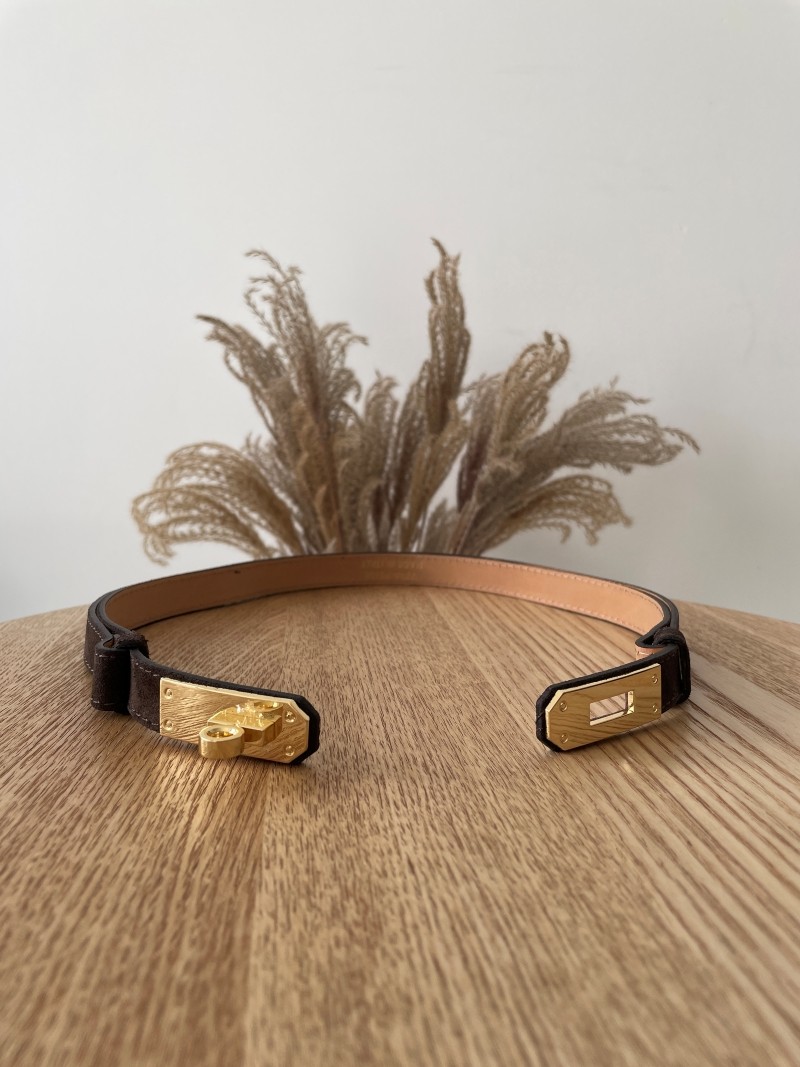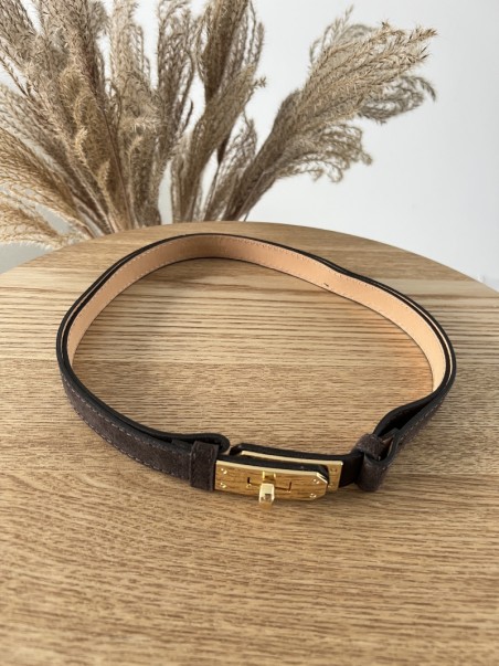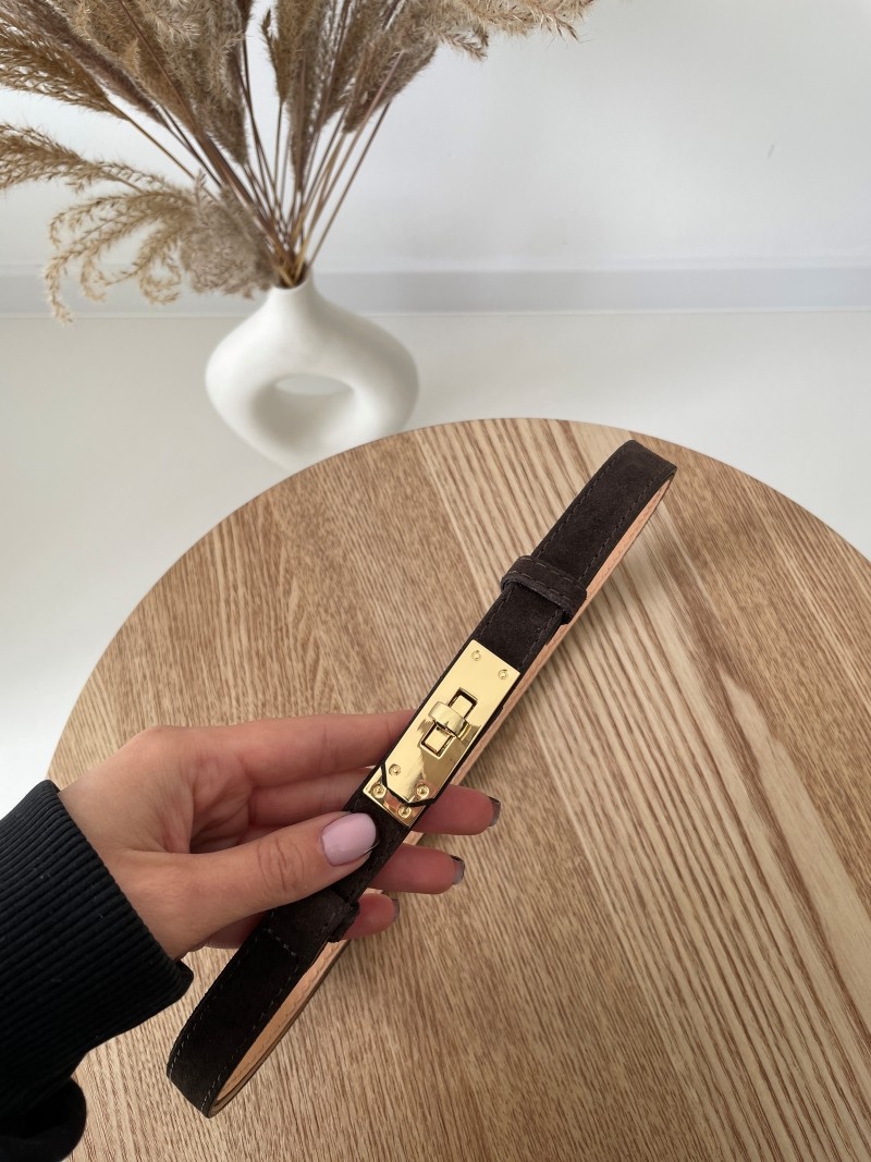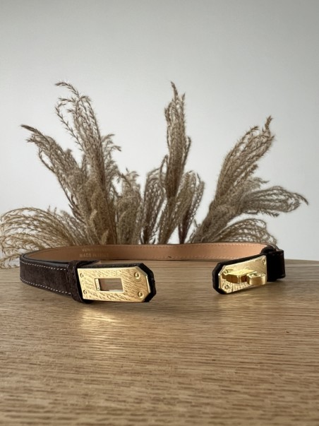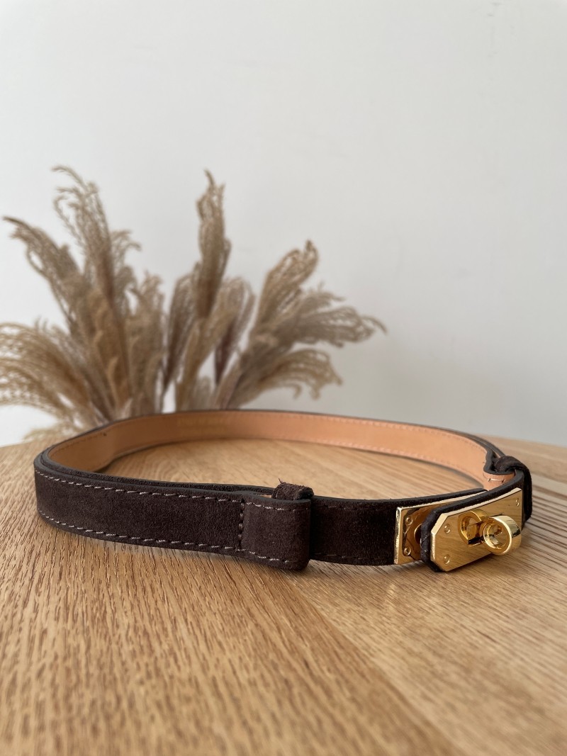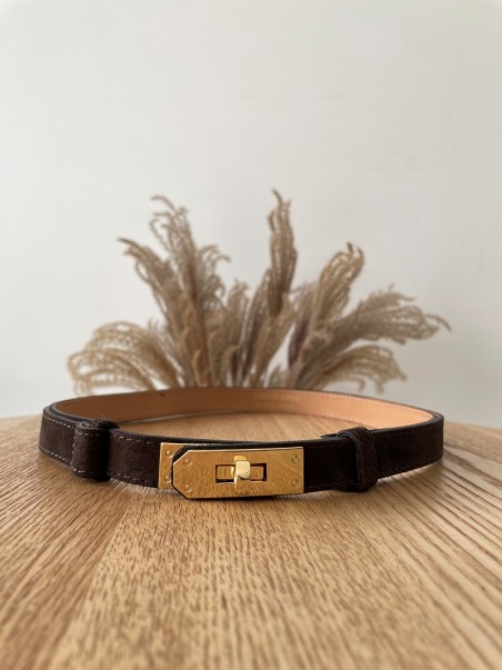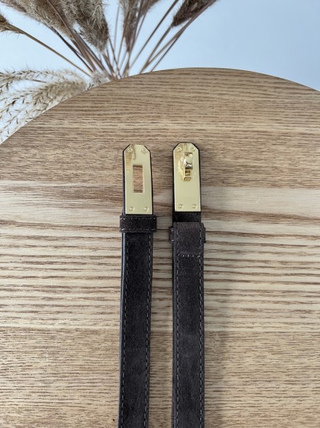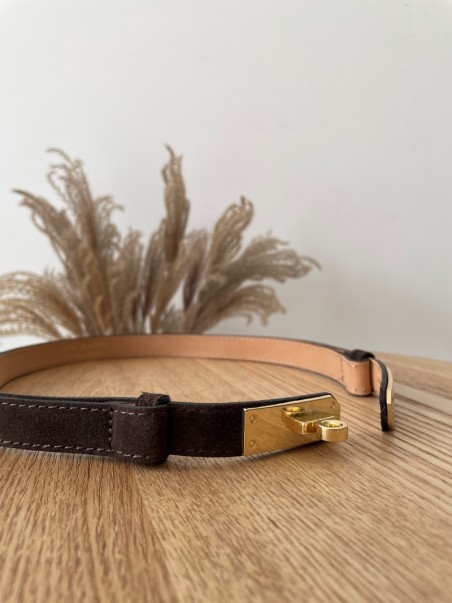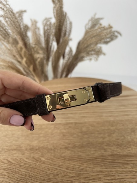 Elegancki pasek wykonany z miękkiej skóry zamszowej w uniwersalnym odcieniu gorzkiej czekolady. Wyposażony w stylową złotą klamrę oraz regulację, która pozwala idealnie dopasować go do sylwetki.