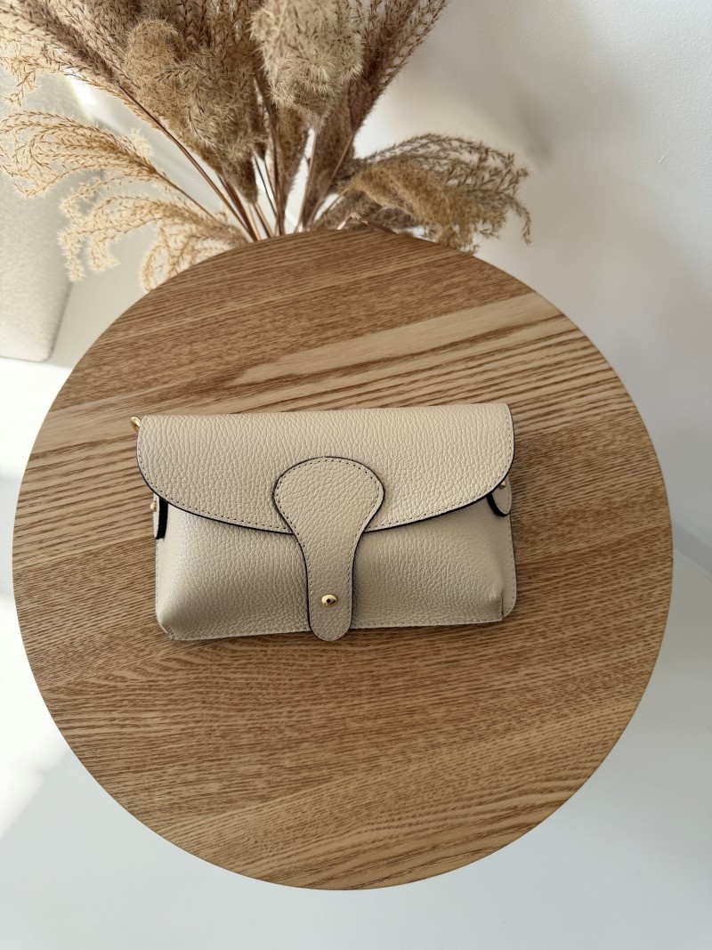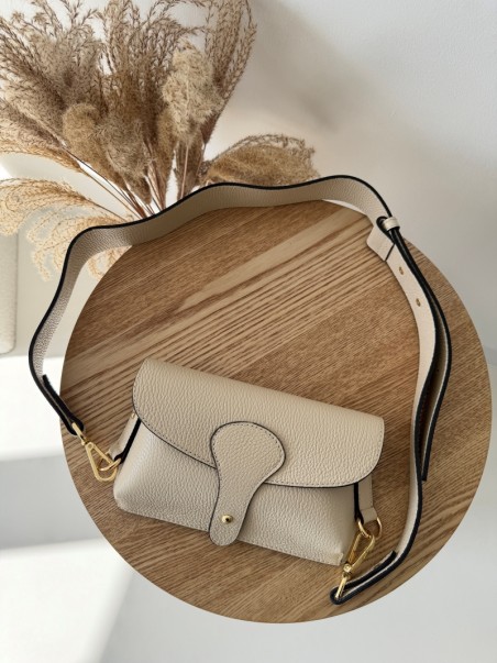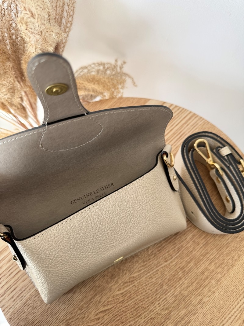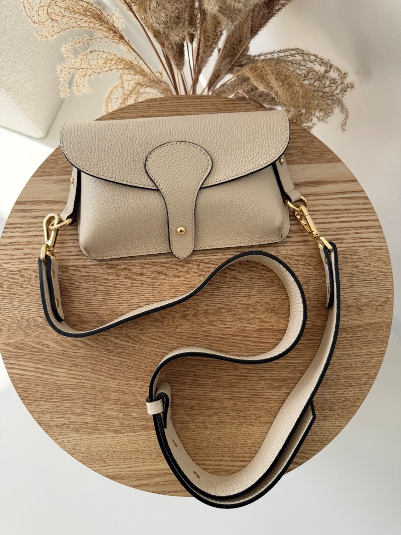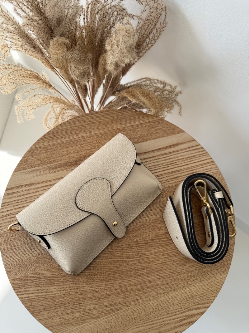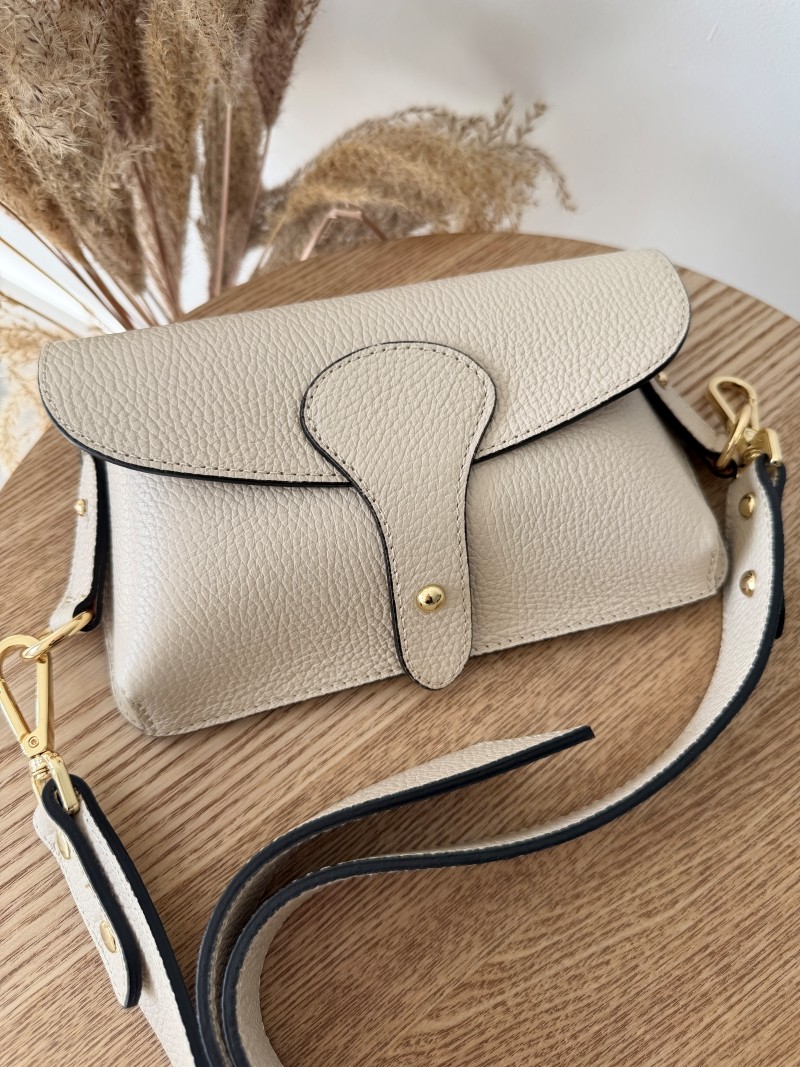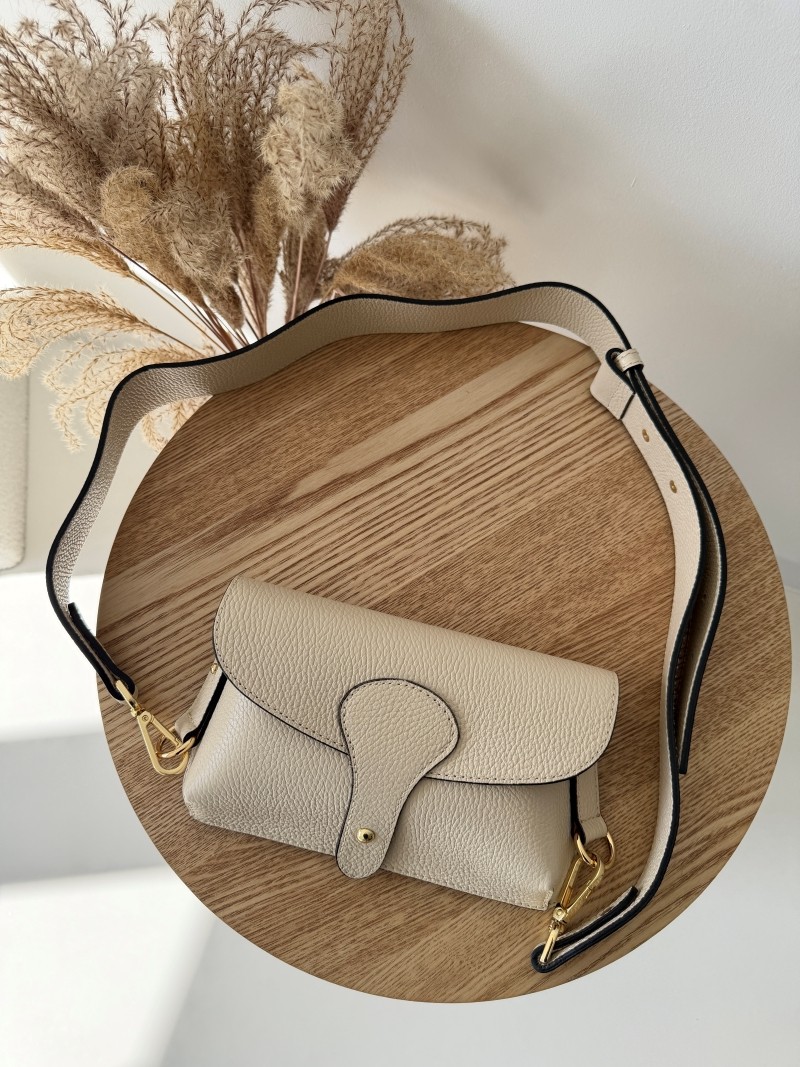 Torebka posiada regulowany pasek na ramię, który umożliwia noszenie jej zarówno jako torebki crossbody, jak i klasycznej listonoszki. Złote detale – klamry i napy – dodają elegancji i podkreślają luksusowy wygląd produktu. Zapięcie na zatrzask zapewnia wygodę i bezpieczeństwo przechowywania.