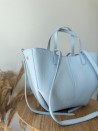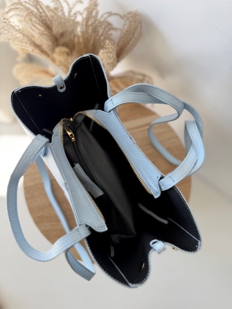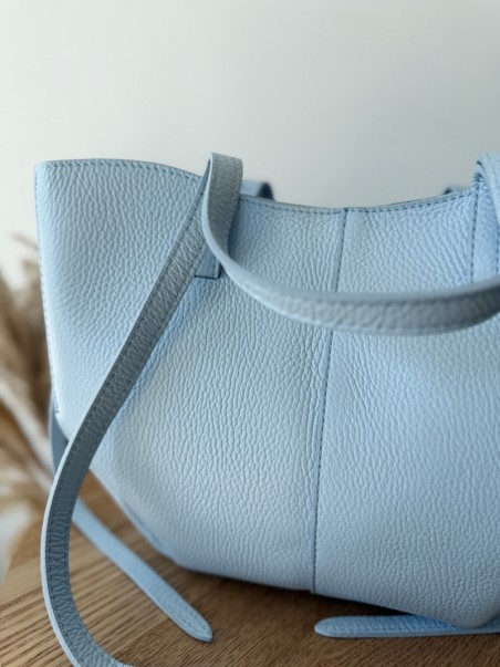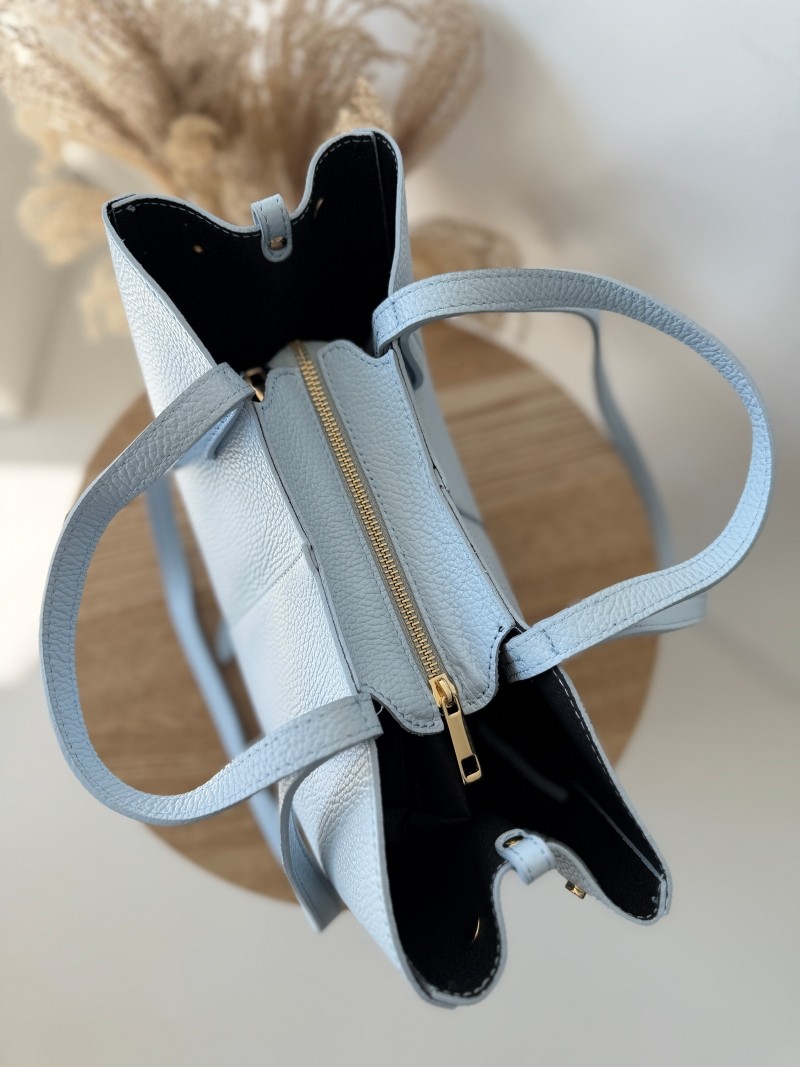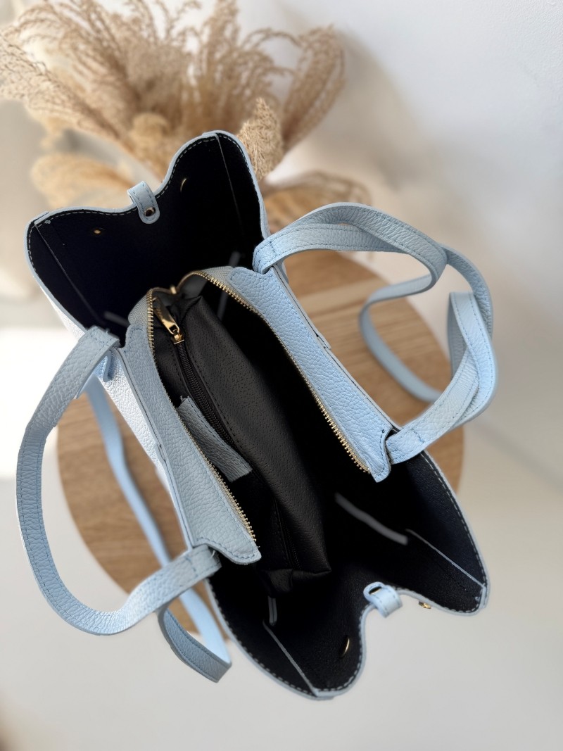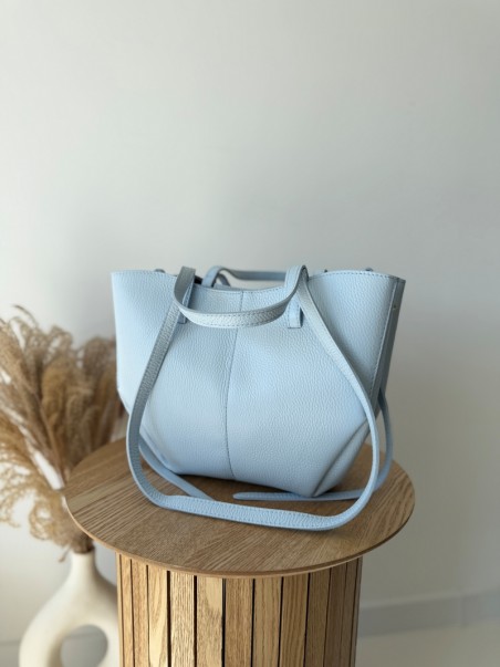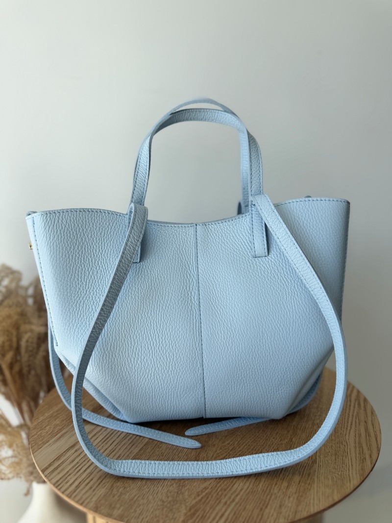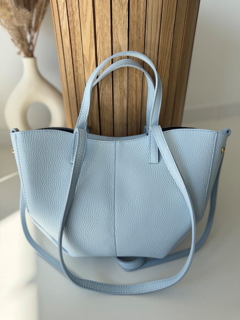 Model wyróżnia się minimalistyczną formą w stylu shopper bag, z dodatkowymi paskami bocznymi oraz dwoma wygodnymi uchwytami do noszenia w dłoni lub na ramieniu. Torebka jest pojemna, a jednocześnie lekka i doskonale sprawdzi się zarówno na co dzień, jak i podczas spotkań biznesowych czy wyjść ze znajomymi. Ponadczasowy odcień niebieski pasuje do wszystkiego – od jasnych lnianych spodni po klasyczny trencz