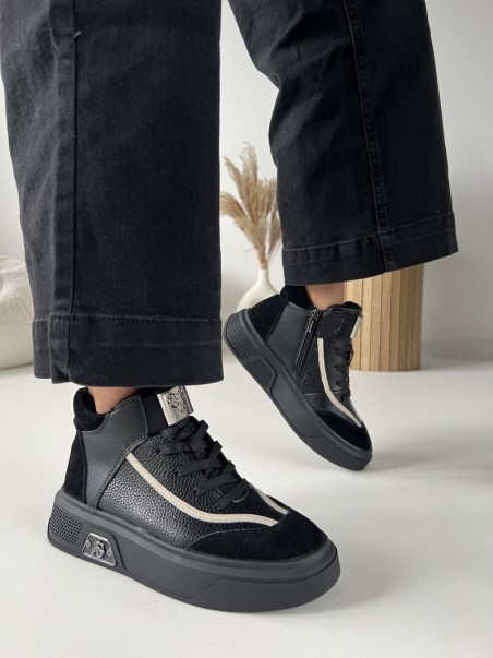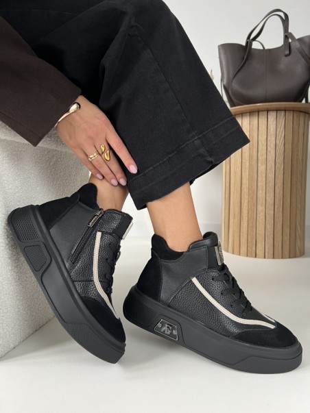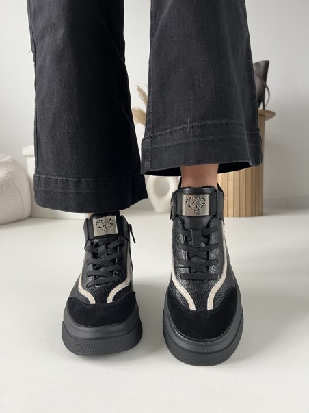 Postaw na komfort i styl przez cały sezon z naszymi czarnymi skórzanymi sneakersami. Ten model to połączenie nowoczesnego designu z najwyższą jakością wykonania. Wykonane w całości z naturalnej skóry licowej i zamszowej, gwarantują trwałość, oddychalność oraz elegancki wygląd na każdy dzień.