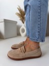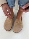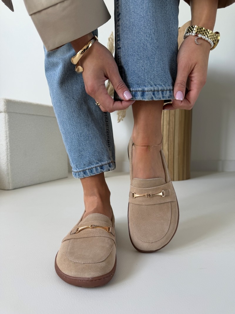 Neutralny, beżowy kolor sprawia, że mokasyny pasują do wszystkiego – od casualowych stylizacji z jeansami po bardziej eleganckie zestawy. Subtelna, złota ozdoba dodaje im klasy i kobiecego charakteru.