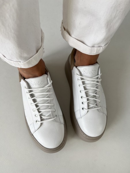 Idealnie dopasowane skórzane sneakersy Evett Raffel w kolorze białym z beżową wstawką oraz beżową podeszwą