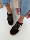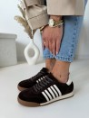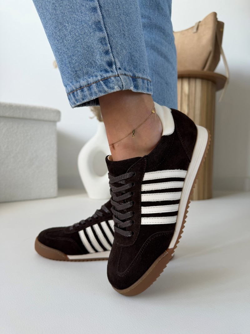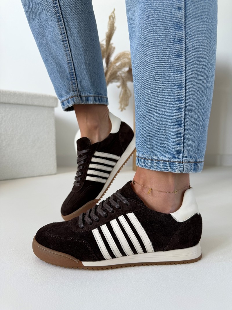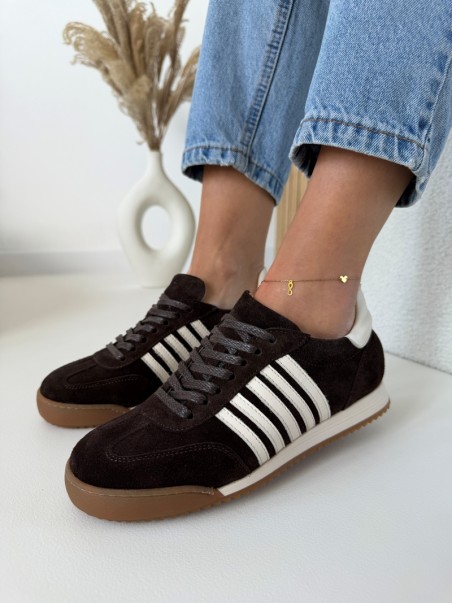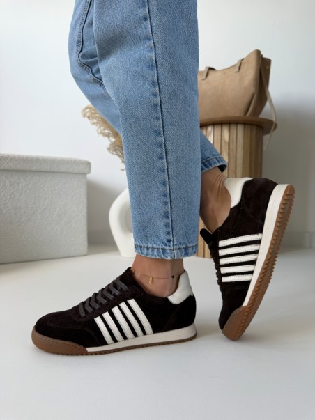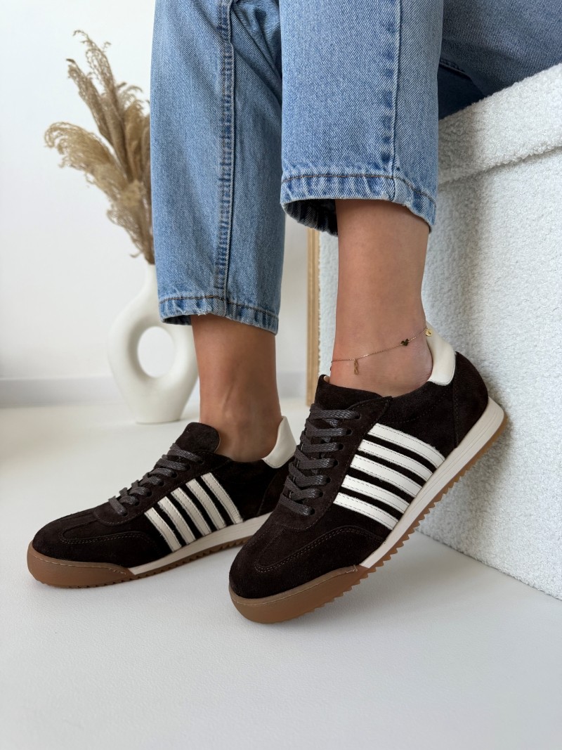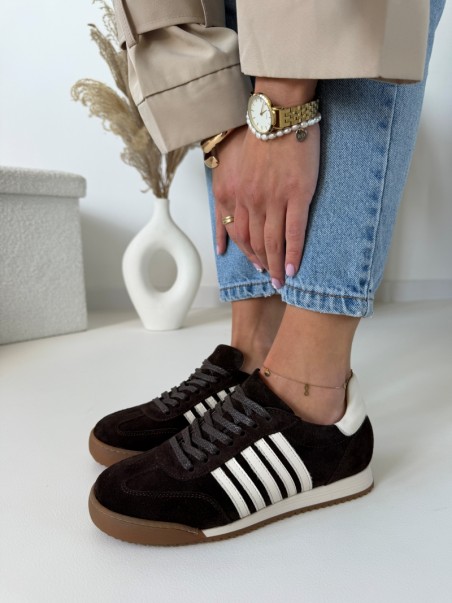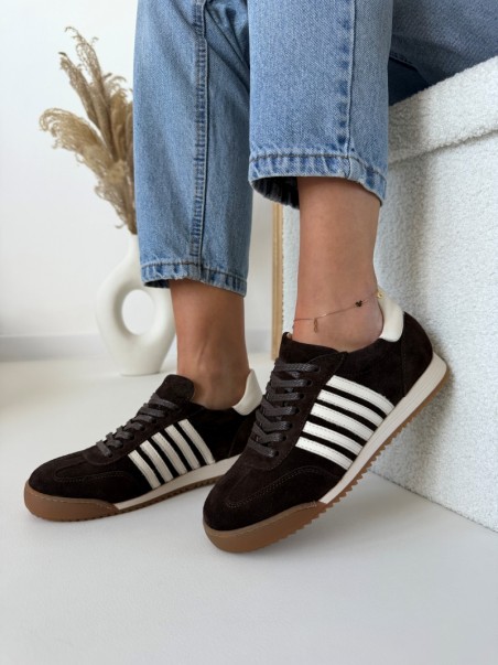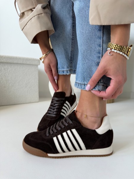 Głęboki, czekoladowy odcień w połączeniu z jasnymi detalami tworzy wyjątkowo modny i ponadczasowy model. Trampki wykonane są z wysokiej jakości naturalnej skóry, dzięki czemu są miękkie, trwałe i idealnie dopasowują się do stopy.